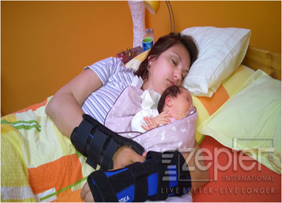 „Po zbadaniu przez lekarza u pani Vicenovej zdiagnozowano infekcję ścięgien w obu ramionach. Nie było jednak dostępnego leczenia dla matki karmiącej piersią. Lekarz zalecił dziesięć sesji magnetoterapii, jednak ból się nasilił. Pani Vicenovej przepisano aparaty unieruchamiające ramiona, w których spała.